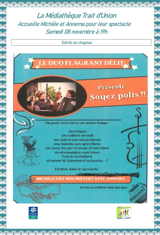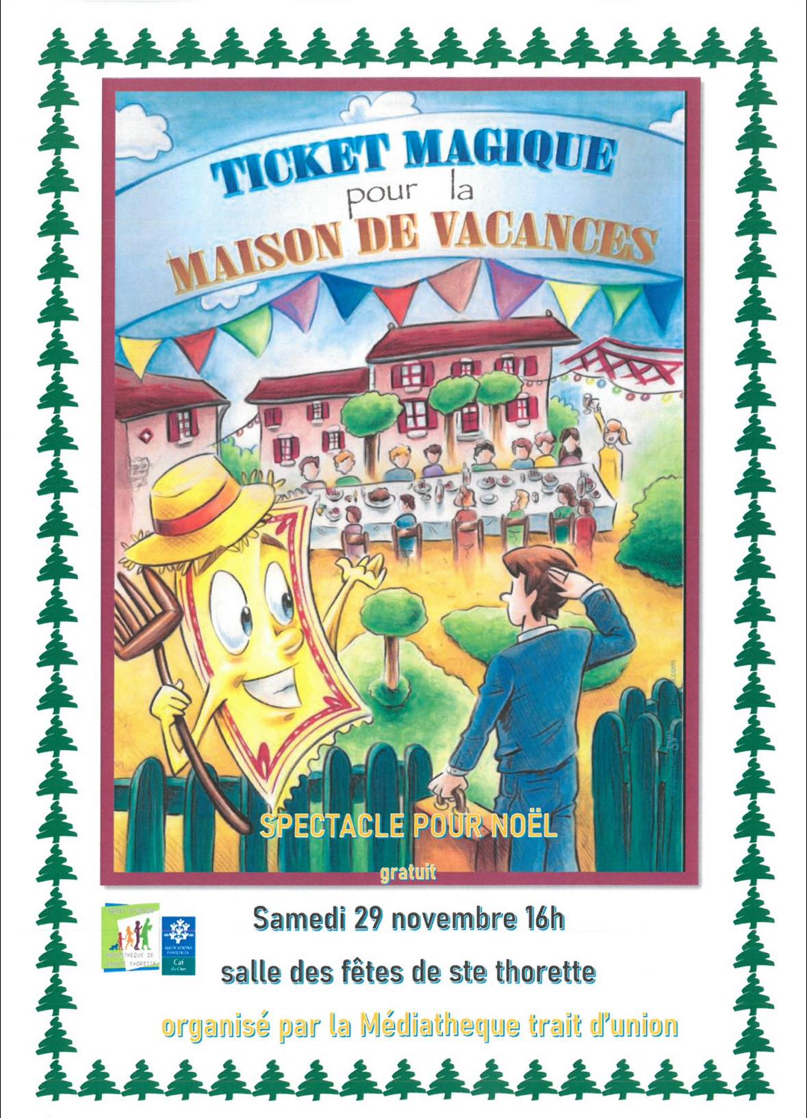 La médiathèque Trait d'Union vous invite au spectacle de Noël "Ticket Magique pour la Maison de Vacances", le samedi 29 novembre à partir de 16h à la Salle des Fêtes de Sainte-Thorette.